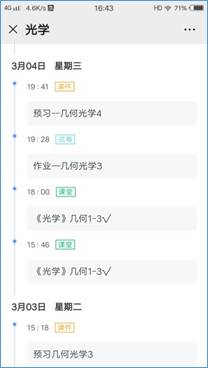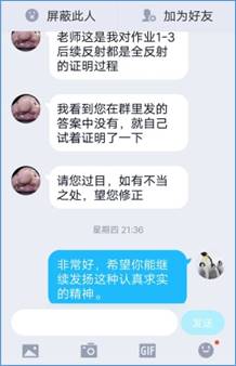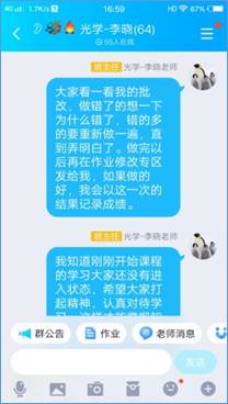 李晓老师本学期承担的是物理学专业的《光学》课程,该课程在授课过程中需要将几何光学的作图过程在线展现给学生。为此,李老师采用了雨课堂与QQ群直播相结合的形式,既利用了雨课堂的预习、弹幕和投稿功能,又利用QQ群直播的屏幕共享弥补了雨课堂不能播放动画的缺点。此外,由于QQ群课堂没有直播回放功能,而直播回放是网络教学的一大优势,同学们可以通过直播回放进行复习。为了弥补这一不足,李老师在课程直播的同时进行录屏,每堂课结束以后将录屏视频发给学生,以便于复习回看。同学们反响良好,都认为这种授课方式有利于加深知识的学习。