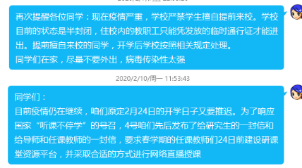 网站和研究生QQ群、微信群及时发布学校关于疫情防控的重要通知、通告,引导全体研究生响应号召,科学面对疫情,做好自我防护。