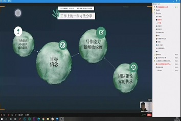 会议上,伊梦寒老师先是向大家提出了疫情期间新闻宣传工作的一点要求:在确保新闻的准确型及高质量的同时,对形态进行创新,内容要更专业,传播要更高效。然后,新闻宣传工作学生骨干刘斌向大家明确了本次会议的目的,即围绕疫情期间新闻宣传工作开展经验分享和问题探讨。接着给大家展开具体培训。培训内容有疫情期间线上新闻工作的主要内容及方式、居家新闻工作与在校新闻工作的经验之和等。刘斌结合疫情期间自己居家进行新闻工作的经历,向大家分享了他的工作经验。“我会利用好网络和av动漫