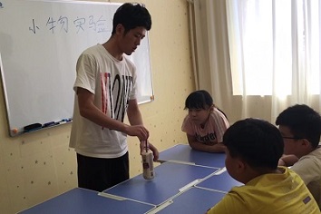 8月10号上午八点半,李兆航同学来到暑假兼职的辅导班,与以往不同的是,这次他带来了一些“装备”,一个矿泉水瓶、一些大米、一根筷子。上课伊始,李兆航同学先是让小朋友们试着操作怎样用一根筷子将瓶子提起来,小朋友们各有各的想法,大家轮流试了一遍,发现在没有老师揭秘的情况下,想把瓶子提起来不是一件容易事。然后,李兆航同学遍向小朋友们演示了正确的提瓶方法:将大米倒入瓶子,把筷子垂直的插入瓶子底部,然后缓缓地提起筷子,这样便可以轻松地将装满大米的矿泉水瓶提起来啦。小朋友们拍手叫好,感叹科学的神奇。演示实验完毕后,小朋友们纷纷发出疑问:为什么这样做就可以把重重的瓶子提起来了?李兆航同学借着小朋友们的疑问,向大家解释了大气压、摩擦力的知识,小朋友们听得津津有味。讲解完原理之后,好学的小朋友们还追问了李兆航同学许多问题,李兆航同学也耐心且通俗地向他们解答了问题。