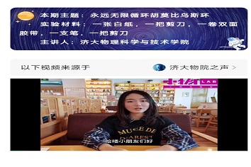 本次实验课堂由吕思琪同学组织志愿者们进行录制。在实验课堂录制过程中,志愿者们以认真负责的态度将自己所学运用到讲解莫比乌斯环的相关知识中来,实验课堂视频录制完成后,志愿者将实验课堂的视频及其讲稿交由山东省少儿图书馆的老师在山东省少儿图书馆的微信公众号上发布,以便长期给浏览的孩子们普及物理知识。实验课堂播出后,志愿者们与小朋友们在评论区内进行互动,给存有问题的孩子解答心中的疑惑。在此次活动中,志愿者们与小朋友们积极互。动,让他们在轻松的氛围中学习知识,活动圆满结束。。